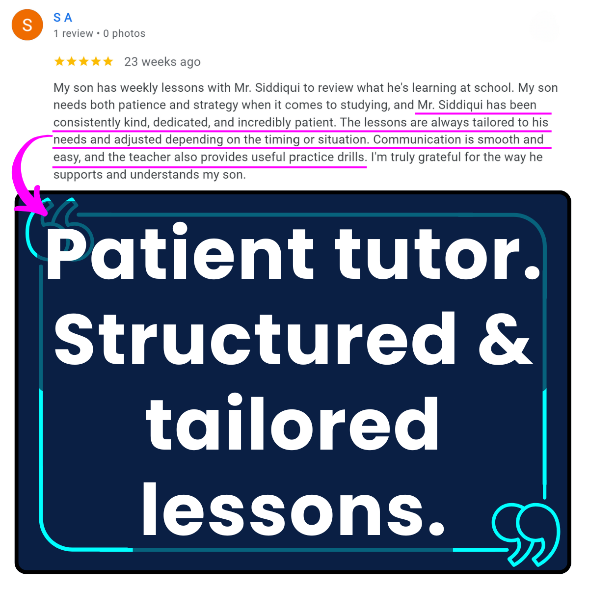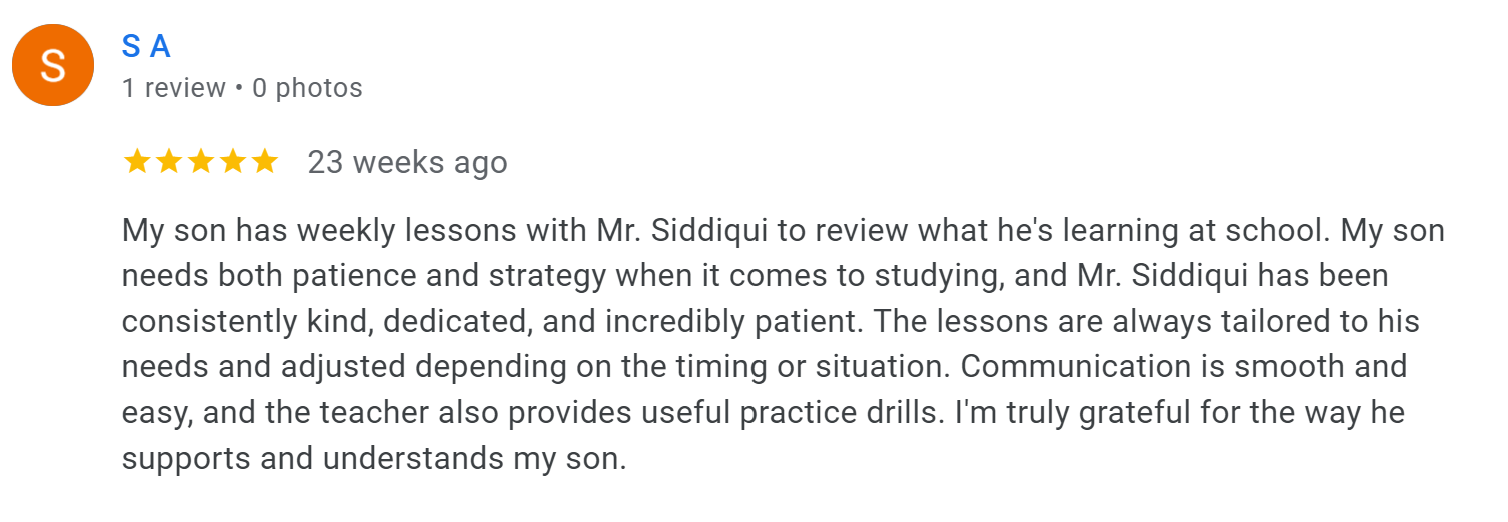 Lessons were consistently adapted to my son’s needs, with clear strategy, useful practice, and calm, supportive teaching.