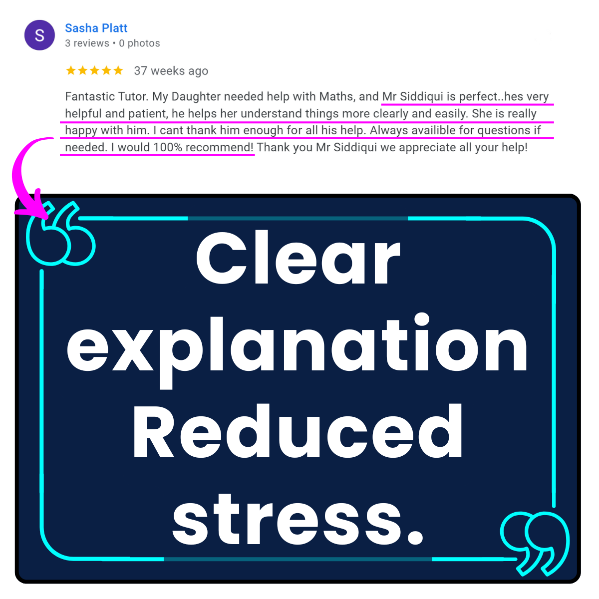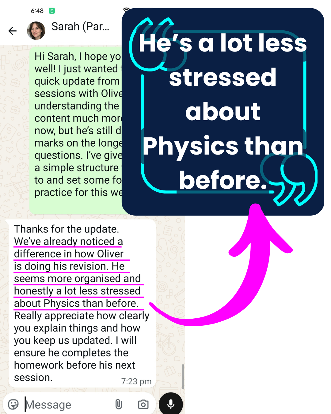 We appreciated the calm, methodical approach. There was no pressure or cramming the content, just clear evidence of progress. Our son improved his mock results significantly and met his sixth form target grades.